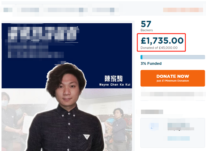 陳家駒還在帖文下附上眾籌鏈接。不過,點開鏈接,可以發現其在眾籌網站要求籌款4.5萬英磅,現在他已籌得1735英磅。↓