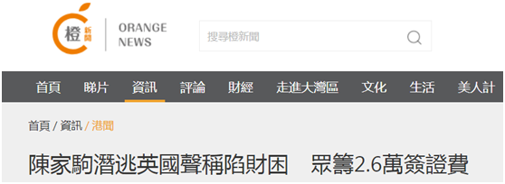 據“星島網”報道,陳家駒上月在臉書中聲稱內地“撕毀”《中英聯合聲明》,併發起目標為4.5萬英鎊的眾籌,以及號召支持者加入所謂“遊説團隊”,要求英國“重新管治”香港,直至港人能行使“自決權”云云。而這條眾籌鏈接也同樣是他今天申請簽證費用眾籌鏈接。
