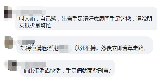 有網友諷刺陳家駒“叫人衝自己松,出賣手足好意思問手足要錢。”“記得他講過‘以死相搏’。然後立即着草走路(潛逃)。”↓