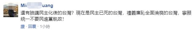 “還有臉講民主化後的台灣?現在是民主已死的台灣,禮義廉恥全面淪喪的台灣,寧願統一不要民進黨執政!”