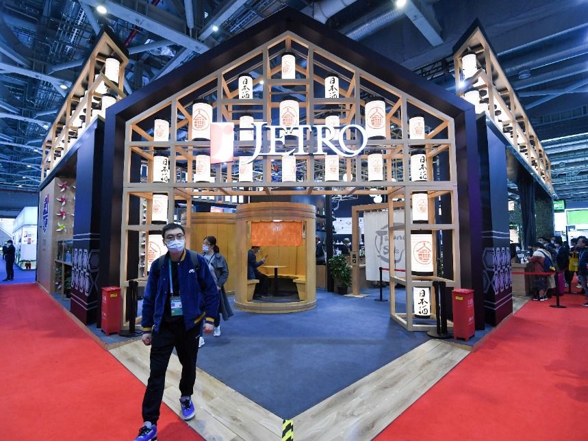 11月10日,觀眾從第三屆進博會食品及農產品展區日本貿易振興機構展台走出。(新華社記者陳曄華攝)