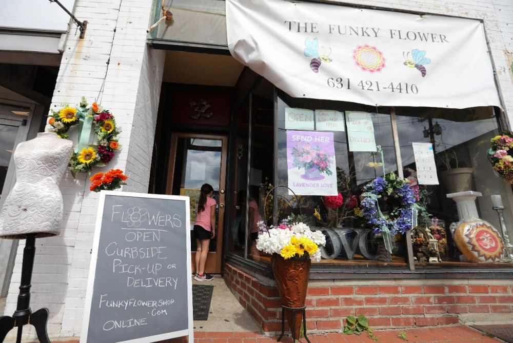 5月27日,在美國紐約州長島地區的薩福克縣,一名女孩向一家營業的花店內張望。(新華社記者王迎攝)