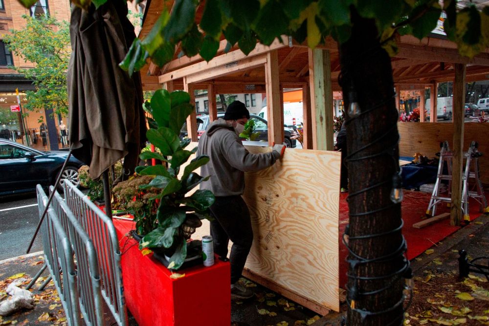 11月13日,在美國紐約,工作人員搭建餐廳户外餐區。(新華社/法新)