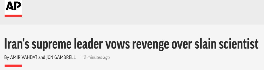 當天早些時候,伊朗總統魯哈尼也曾指責以色列。他在28日的電視內閣會議中説,伊朗人民不會落入以色列的圈套中。“伊朗肯定會在適當的時候對我們科學家的殉難作出回應。”魯哈尼説道。