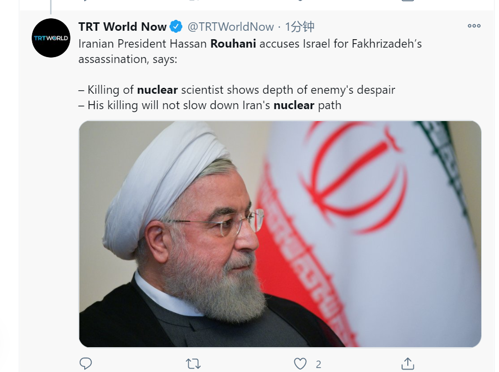 【環球網快訊】據土耳其廣播電視協會(TRT)剛剛消息,伊朗總統魯哈尼指責以色列暗殺伊朗首席核科學家穆赫森·法赫裏扎德。他還表示,伊朗首席核科學家被暗殺一事顯示出“敵人的絕望程度”,殺害他不會減緩伊朗的核進程。