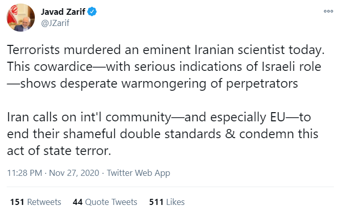 伊朗外長扎裏夫表示,以色列可能在星期五參與了殺害伊朗著名核科學家法赫裏扎德的行動,這種懦弱的行為顯示出肇事者急切的好戰行為。伊朗呼籲國際社會,尤其是歐盟,結束他們可恥的雙重標準,並譴責這一國家恐怖行為。