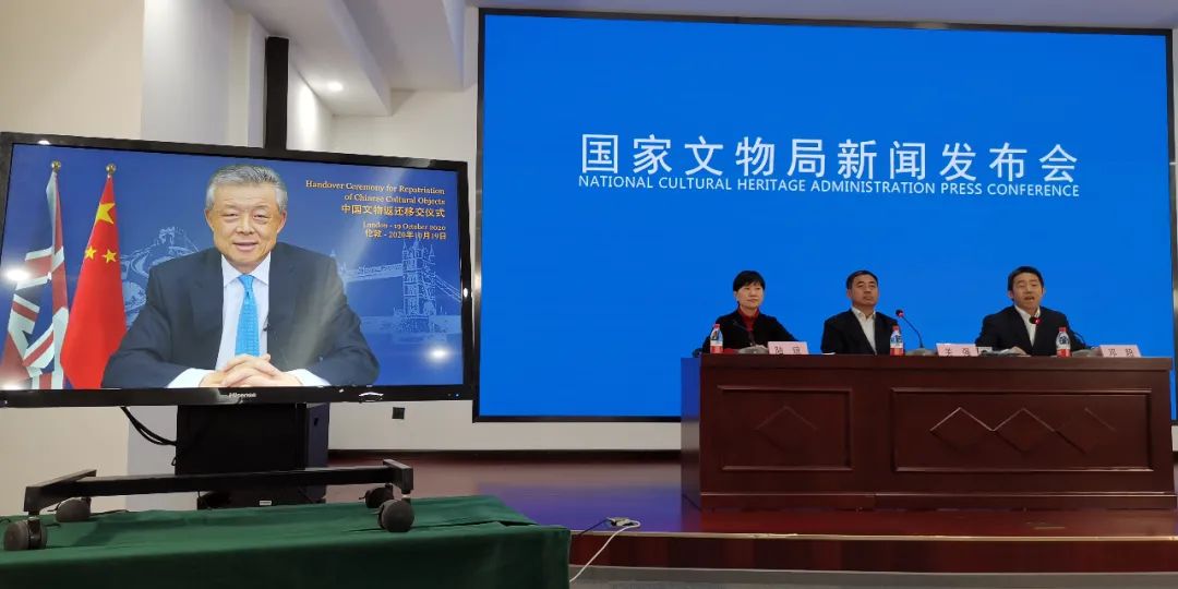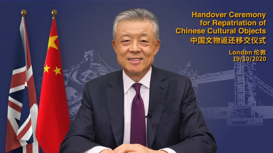 10月19日,劉曉明大使在使館舉行線上中國文物返還移交儀式。劉大使在致辭中感謝英國政府和倫敦大都會警察局的鼎力支持,表示此次中國文物返還為中英文物保護合作提供新動力,為中英聯合打擊文物走私樹立新典範,也為中英友好交往注入正能量。倫敦大都會警察局藝術品與文物犯罪科探員海斯介紹了該批文物返還背景情況,英國數文媒體部創意產業國際戰略政策顧問、對華合作團隊負責人裏德利以及倫敦大都會警察局副總督察馬丁先後致辭。儀式結束後,這批流失英國25年的文物終於踏上了回家的路。