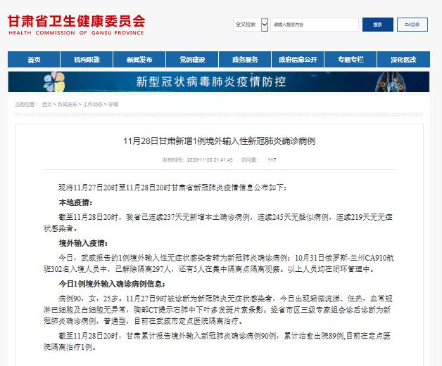 截至11月28日20時,甘肅累計報告境外輸入新冠肺炎確診病例90例,累計治癒出院89例,目前在定點醫院隔離治療1例。