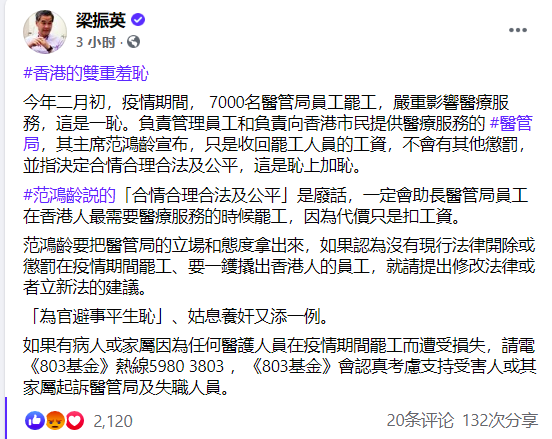 梁振英28日在臉書發佈標題為“香港的雙重恥辱”帖文。他稱,今年2月初,疫情期間, 7000名醫管局員工罷工,嚴重影響醫療服務,這是一恥。負責管理員工和負責向香港市民提供醫療服務的醫管局,其主席範鴻齡宣佈,只是收回參與罷工人員的工資,不會有其他懲罰,並指決定“合情合理合法及公平”,這是恥上加恥。