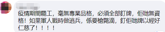 對於香港醫管局僅向參加罷工的醫護扣薪,有香港網友説,疫情期間罷工,毫無專業品格,必須全部吊銷資格,他們沒資格再當醫護!如果軍人戰時做逃兵,是要槍斃的,吊銷資格已經很仁慈了。↓