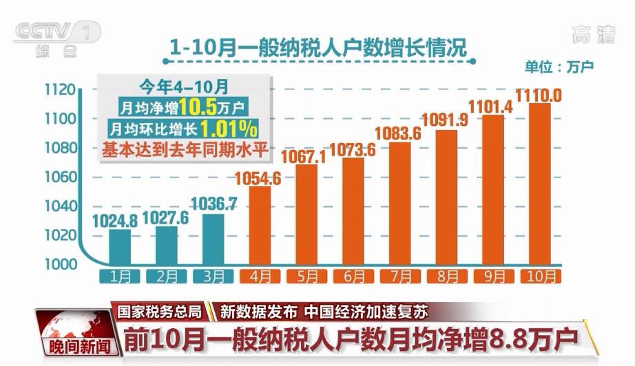 國家税務總局:前10月一般納税人户數月均淨增8.8萬户