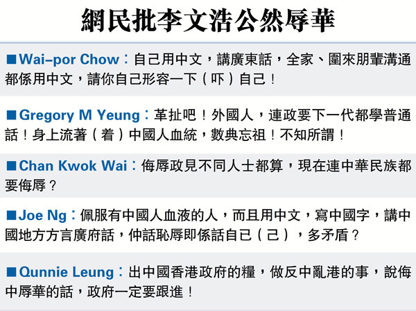 有香港網友在網上留言罵李文浩:“身上流着中國人的血統,數典忘祖!不知所謂!”還有網友質問他:“咁你又用中文字?(那你還用中文字?)”更有網友直斥:“你(李文浩)才是過街老鼠,全世界華人社會見到就打。”