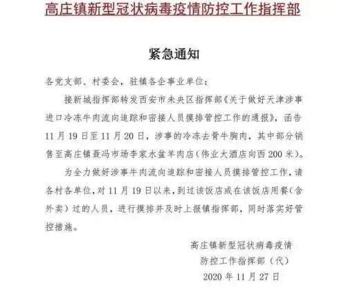 11月19日至20日,涉事冷凍去骨牛胸肉部分分銷至西 鹹新區涇河新城高莊鎮聶馮市場李家水盆羊肉店 (偉業大酒店向西200米),11月19日以來,到過該飯店或在該飯店用餐(含外賣)過的人員,進行摸排並及時上報鎮指揮部 ,落實好管控措施。