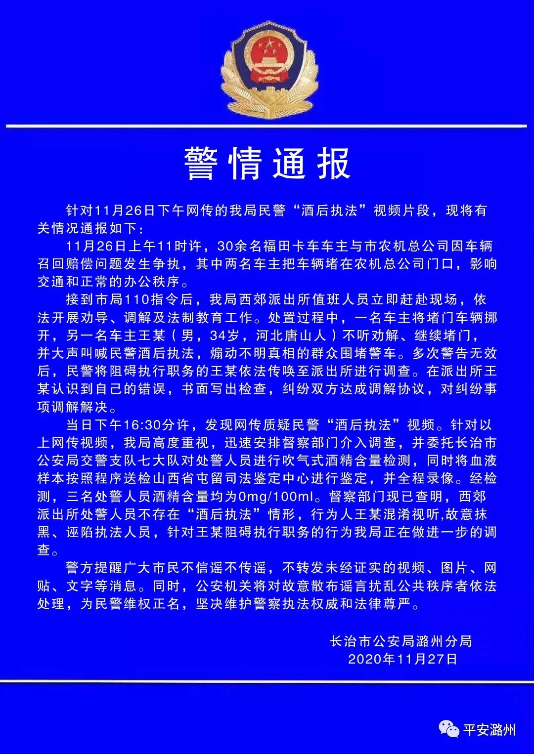 當日下午16:30分許,發現網傳質疑民警“酒後執法”視頻。針對以上網傳視頻,我局高度重視,迅速安排督察部門介入調查,並委託長治市公安局交警支隊七大隊對處警人員進行吹氣式酒精含量檢測,同時將血液樣本按照程序送檢山西省屯留司法鑑定中心進行鑑定,並全程錄像。經檢測,三名處警人員酒精含量均為0mg/100ml。督察部門現已查明,西郊派出所處警人員不存在“酒後執法”情形,行為人王某混淆視聽,故意抹黑、誣陷執法人員,針對王某阻礙執行職務的行為我局正在做進一步的調查。