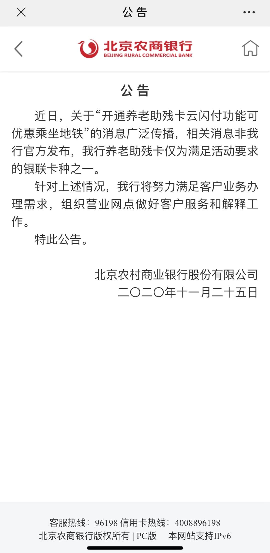 北京農商銀行為此發佈公告稱:“近日,關於‘開通養老助殘卡雲閃付功能可優惠乘坐地鐵’的消息廣泛傳播,相關消息非我行官方發佈。”