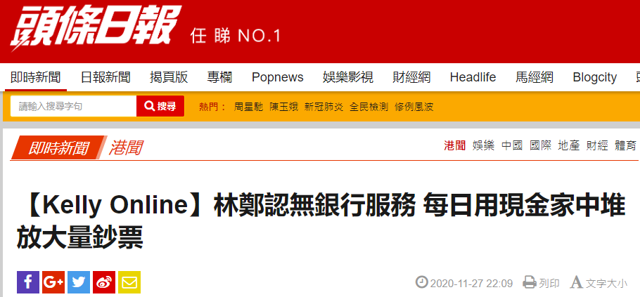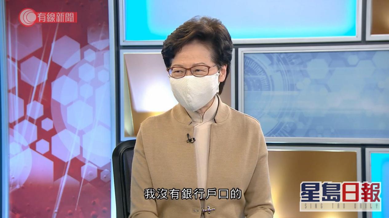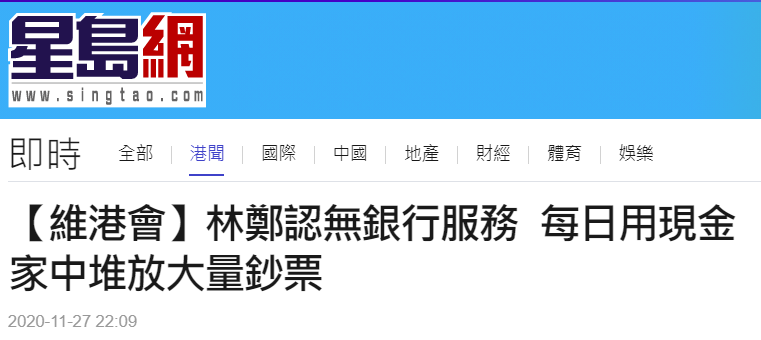 香港“星島網”、《頭條日報》報道,林鄭月娥接受香港有線電視英文專訪時,被問到美國因香港國安法對她實施制裁後生活有沒有不便,她透露她作為香港的首長,沒有銀行能提供服務,她每日用現金買所有的東西。