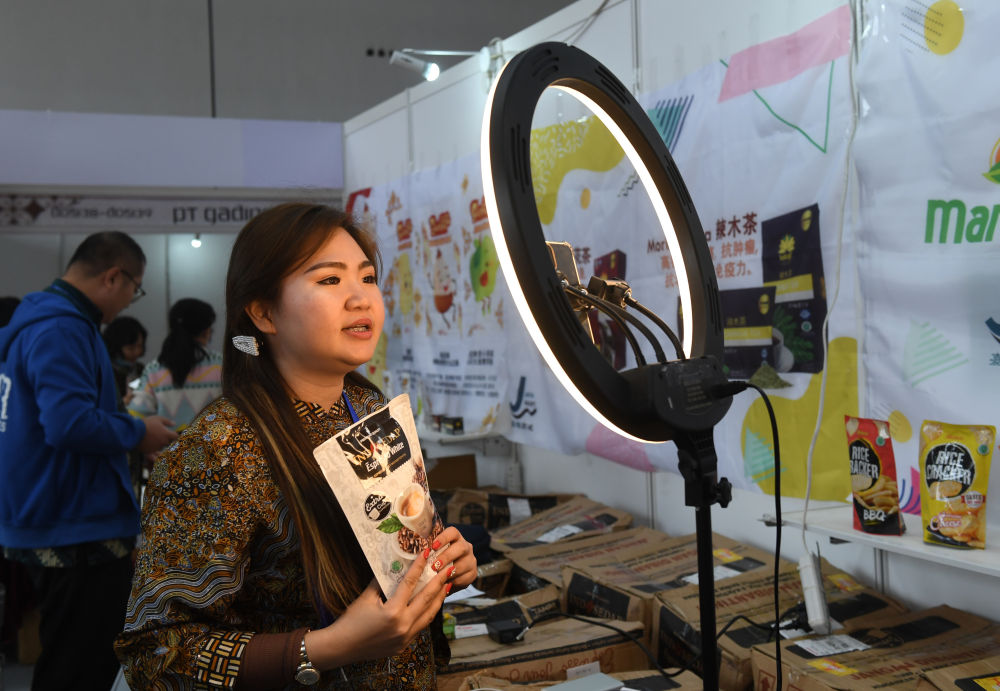 11月27日,在南寧國際會展中心,參展商通過網絡直播推銷商品。 新華社記者 陸波岸 攝