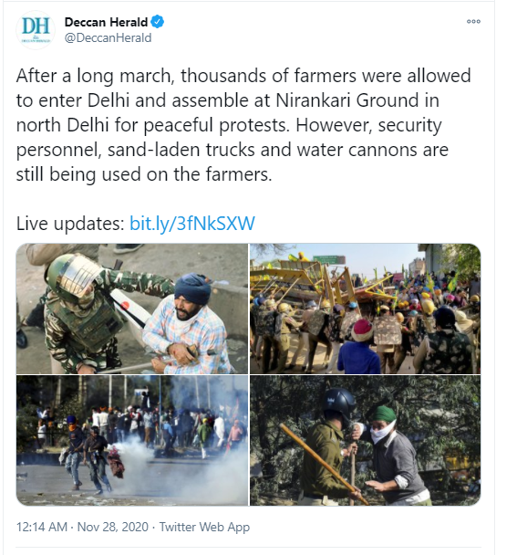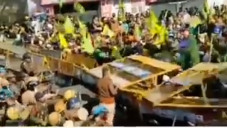 一些印度媒體和社交網站上給出的視頻和圖片還顯示,這些印度農民前兩天還曾在前往新德里的路上一度與阻攔他們的印度軍警爆發了激烈的肢體衝突: