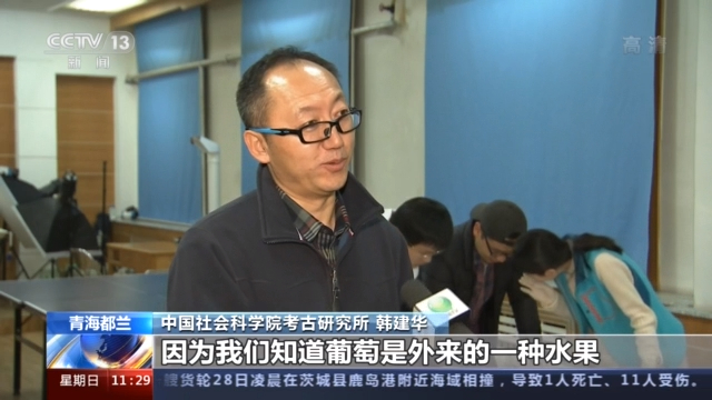 中國社會科學院考古研究所 韓建華: 發現有葡萄紋,因為我們知道葡萄是外來的一種水果,而這種紋樣在織物裏面出現,那就更説明這個一個是外來文化因素對這個地方的影響,但是它織物裏結構和工藝是咱們中原的特色,所以就是説我們在吸收外來文化因素,創造一種新的樣式。説到葡萄紋的樣式,我們在墓葬裏面還發現了葡萄籽,所以就説這地方當時的貿易往來是非常發達。