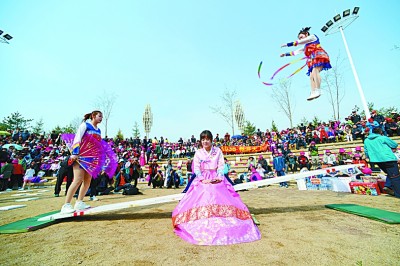 金達萊村村民為遊客表演朝鮮族民俗“跳蹺蹺板”。