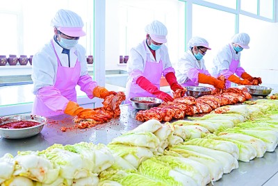 如今,金達萊村的元池辣白菜是遠近聞名的品牌。在元池蔬菜有限公司,幾十名工人正忙着洗白菜、抹辣椒、密封。相關負責人介紹,辣白菜的銷路很好,通過線上線下兩種渠道,產品銷售到上海、北京、青島等城市,供不應求。