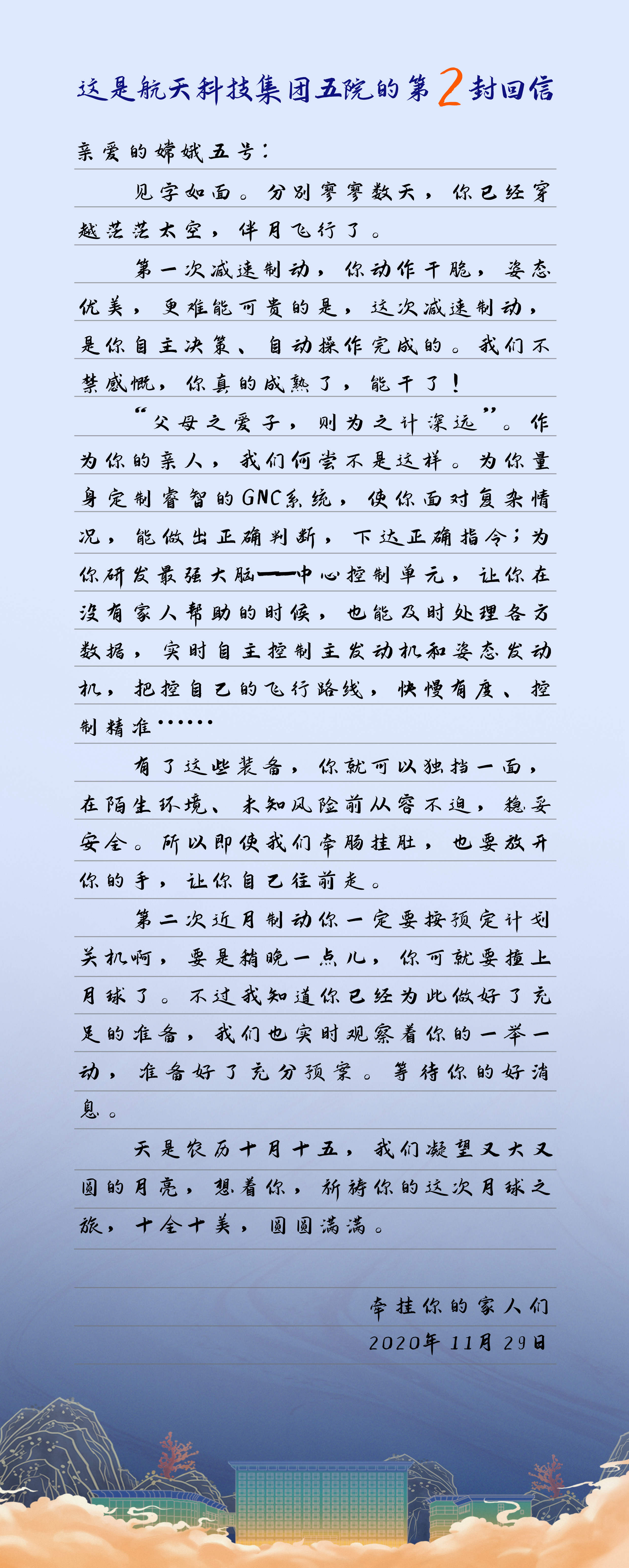 航天五院回信嫦娥五號:已為第二次近月制動備好充分預案 祝願這次月球之旅圓圓滿滿