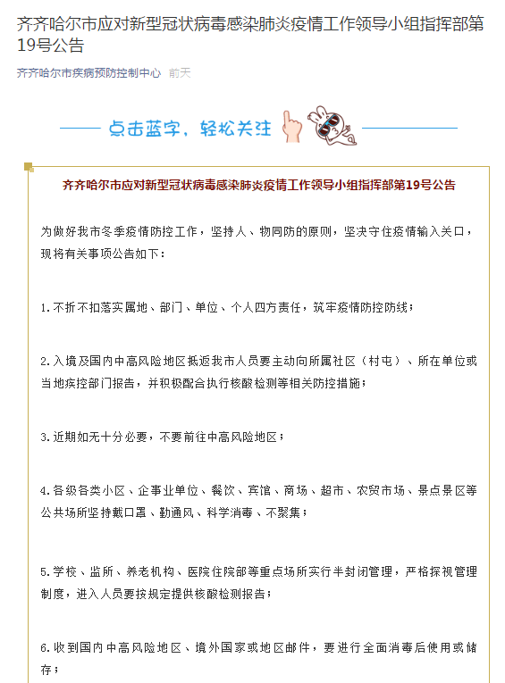 齊齊哈爾市應對新型冠狀病毒感染肺炎疫情工作領導小組指揮部第19號公告