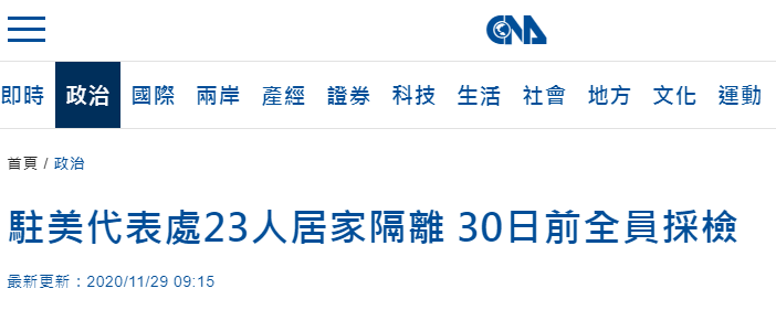 台媒:台灣“駐美代表處”23人與新冠確診者接觸後隔離觀察