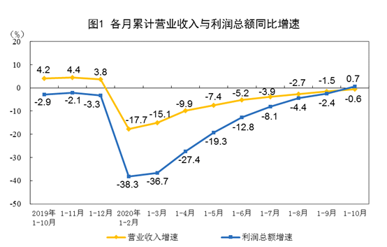 五是私營企業利潤和外資企業利潤恢復向好 。隨着一系列助企紓困和金融支持實體經濟政策落地見效,各類市場主體活力穩步恢復,盈利狀況改善。1—10月份,私營企業利潤同比增長1.1%,1—9月份為下降0.5%;外商及港澳台商投資企業利潤增長3.5%,增速加快0.9個百分點。
