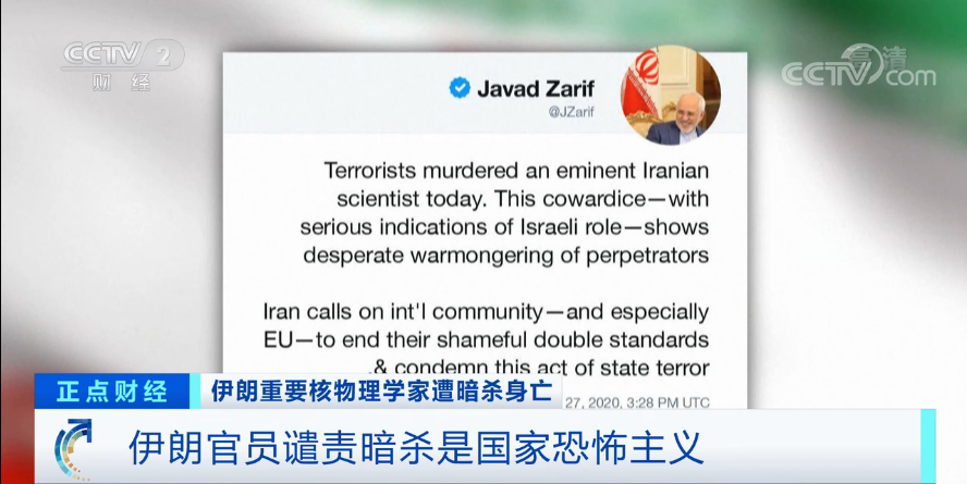伊朗外長扎裏夫29日在社交媒體上表示,“恐怖分子謀殺了一名偉大的伊朗科學家,伊朗呼籲國際社會放棄雙重標準,譴責這種形式的國家恐怖主義”。扎裏夫還表示,“暗殺法克里扎德的行為帶有以色列政權暴行的明顯特徵”。