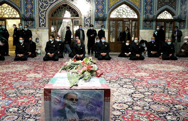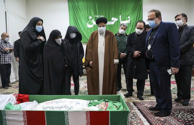 圖為伊朗司法部長和法克里扎德的家人站在他的遺體旁(來源:路透社)