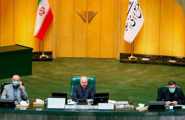 伊朗議會議長Mohammad-Bagher Ghalibaf(中)在首都德黑蘭主持秘密會議,調查法克里扎德被殺事件