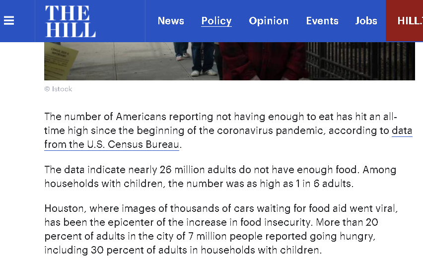 △《國會山報》:根據美國人口統計局,休斯敦地區,超過20%的成年人正在捱餓。
