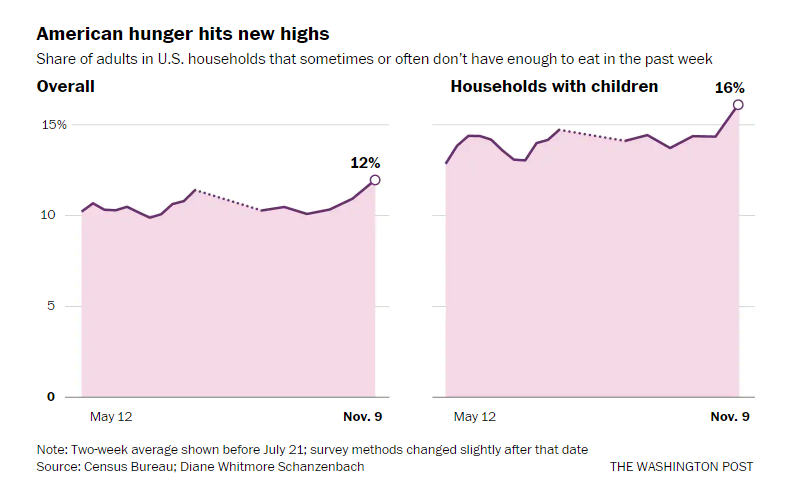 △美國人口統計局:過去一週(統計截至11月9日)美國家庭中有時或經常沒有足夠食物的成年人所佔比例(圖片來源:《華盛頓郵報》)