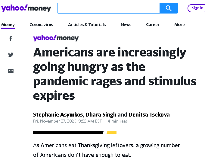 △據雅虎報道,隨着新冠疫情肆虐和刺激政策到期,美國人的飢餓感越來越強