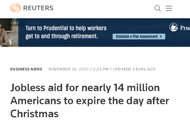 △路透社稱,近1400萬美國人的失業救濟將在聖誕節後一天到期