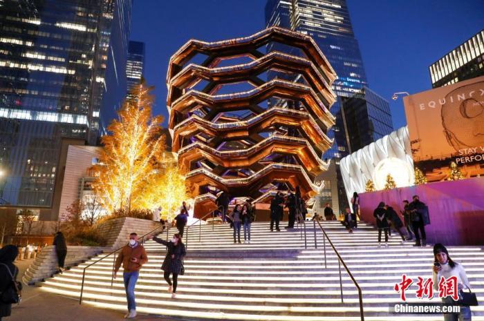 當地時間11月26日,美國傳統節日感恩節,民眾遊覽夜色中的哈德遜廣場。中新社記者 廖攀 攝