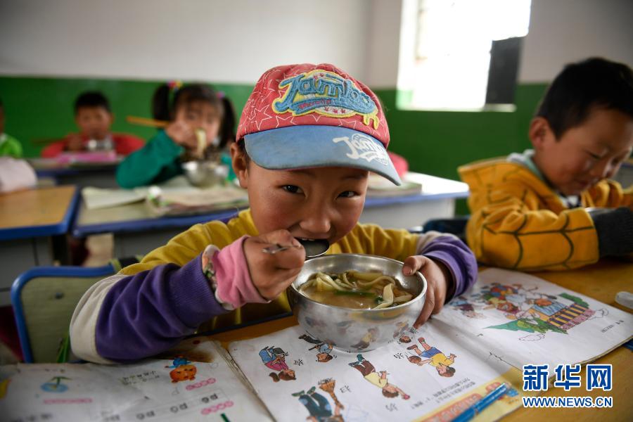 寧夏西吉縣震湖鄉陳岔小學的孩子在教室吃午餐,學生每天在學校有兩頓國家提供補助的營養餐(2017年6月14日攝)。新華社記者 王鵬 攝