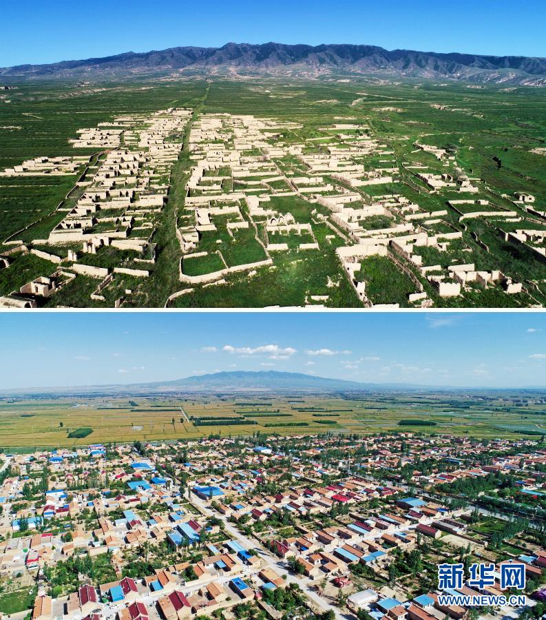 這是一張拼版照片,上圖為:經過多年的生態修復,寧夏吳忠市紅寺堡區新莊集鄉的移民舊址已逐漸被綠色覆蓋;下圖為:戈壁荒灘上建起的紅寺堡移民新村(2018年9月8日攝,無人機照片)。新華社記者 王鵬 攝