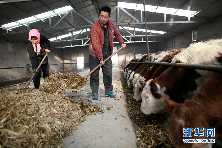 寧夏吳忠市同心縣河西鎮旱天嶺村村民馬國才(右)、馬婷夫婦在村裏的養牛合作社餵牛(2017年12月21日攝)。新華社記者 王鵬 攝