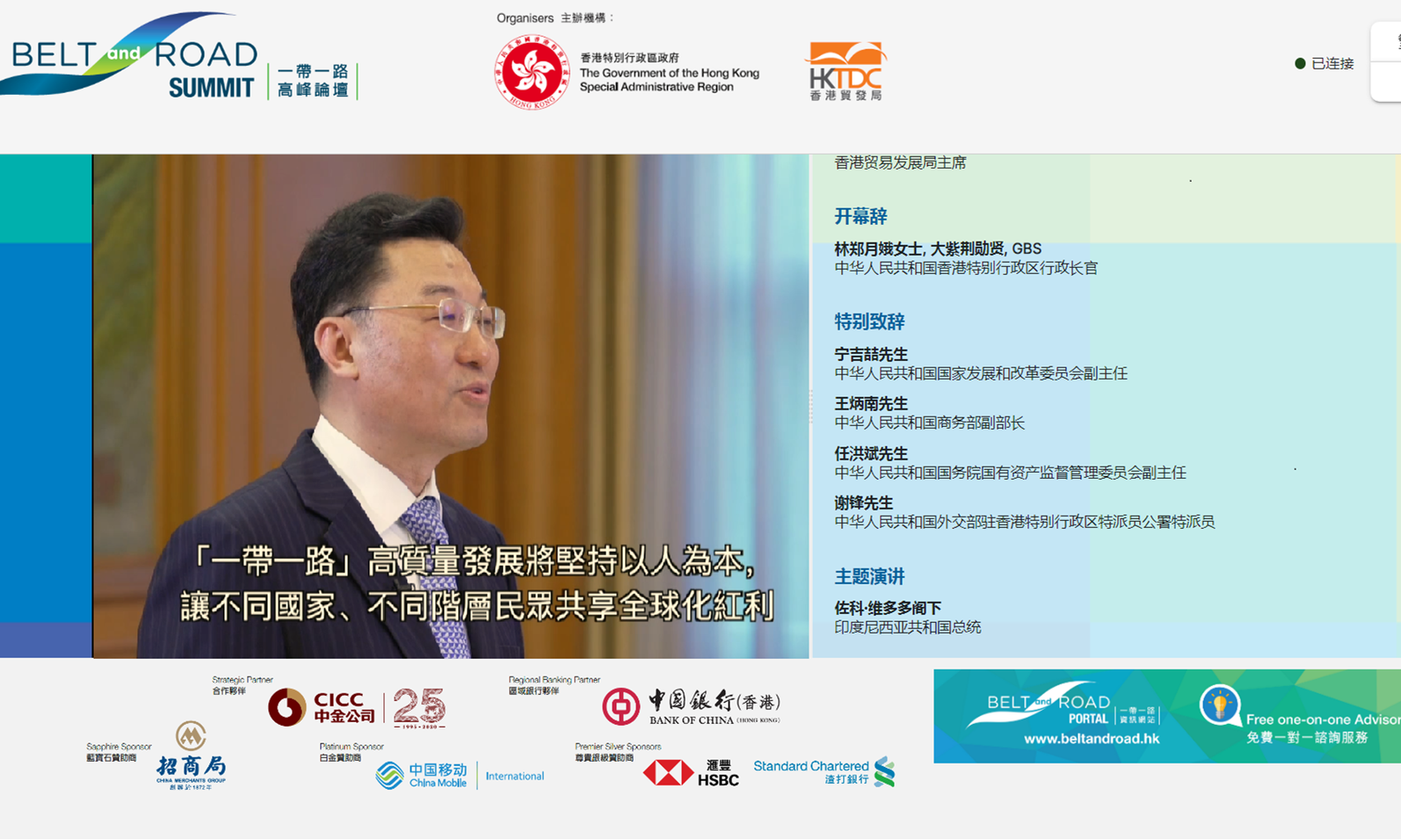 自2016年起,香港特區政府聯合香港貿易發展局每年舉辦“一帶一路”高峯論壇,今年是第五屆。本屆論壇以“洞悉商機 共建可持續及共融的未來”為主題,以在線形式舉行,邀請了80餘位來自內地、香港及世界各國的政府官員和商界領袖就“一帶一路”如何帶動全球經濟復甦、幫助企業走出困局等開展深入探討,共計約五千名世界各地政商精英在線參會。