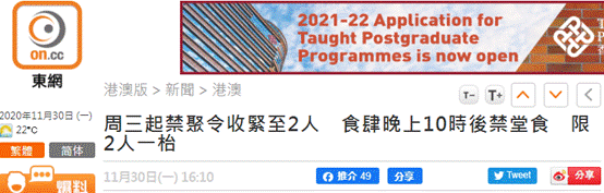 港媒:香港12月2日起“限聚令”收緊至2人,公務員需在家辦公