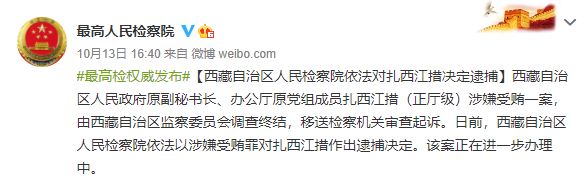 西藏自治區人民檢察院依法對扎西江措決定逮捕