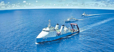 搭載“奮鬥者”號的“探索一號”船(前一)。 中國科學院供圖