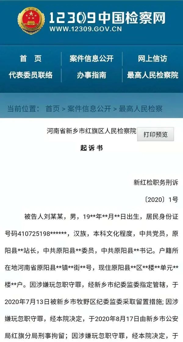 11月27日,新鄉市紅旗區人民檢察院公佈的起訴書顯示,原陽縣建築工程質量監督站站長劉某某,工作中嚴重不負責任,收受他人財物後,為徇私情翫忽職守,致使國家和人民利益遭受重大損失,檢察院以翫忽職守罪向法院提起公訴。