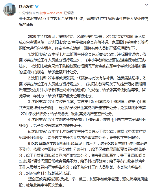 1.瀋陽市第127中學七年二班班主任金某違反廉潔紀律,違反職業道德,依據《事業單位工作人員處分暫行規定》、《中小學教師違反職業道德行為處理辦法》、《瀋陽市教育局關於防控新冠疫情期間嚴肅查處在職中小學教師違規補課的通知》的規定,給予金某開除處分。