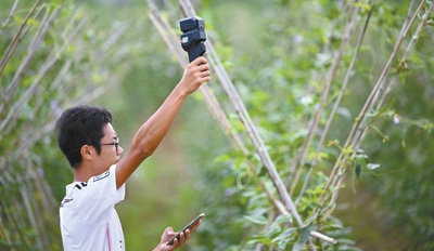 9月20日,廣西壯族自治區柳州市魚峯區白沙鎮,工作人員在豆角基地裏測量需要無人機飛防作業的地塊。近年來,該區推廣害蟲智能化捕捉、無人機飛防作業等智能化技術應用,提高耕作、播種效率與質量。