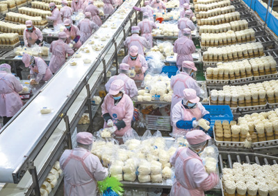 11月5日,江蘇省泗陽縣某生物科技公司金針菇包裝生產線正在進行標準化、機械化生產。