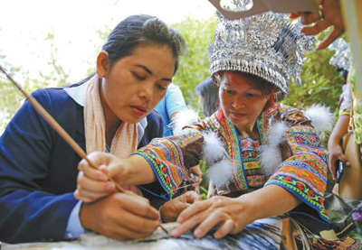 在中國廣西柳州市融水苗族自治縣,來自柬埔寨實居省的春莉提向苗家女學習竹編技藝。
