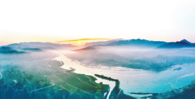 中國雲南西雙版納景洪市瀾滄江日出景象。